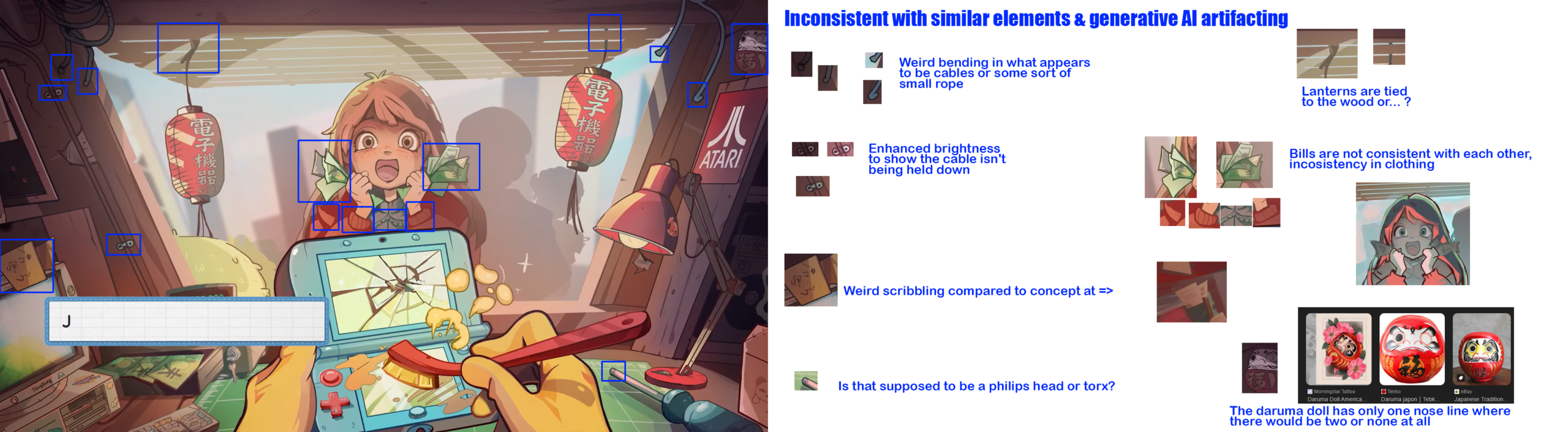In this screenshot we only need to look at elements that should be repeating a pattern or work the same way. The character is hold money bills and from experience we know that the details on the bills should be consistent with each other (provided they are the same currency).